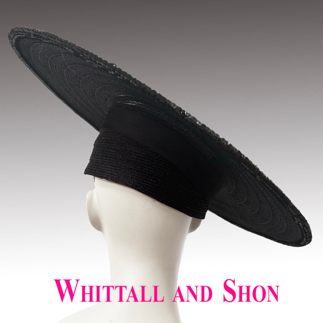 “ROULETTE”—a playful hat that channels the excitement of the iconic game. This striking piece features an 18” diameter round disc set atop a bubble base, creating a bold and modern silhouette. The design is framed with shimmering black sequins. Two vibrant slots of eye-popping color break through the sleek black palette, capturing the spirit of chance and fortune. Perfect for the gambler at the Derby!
